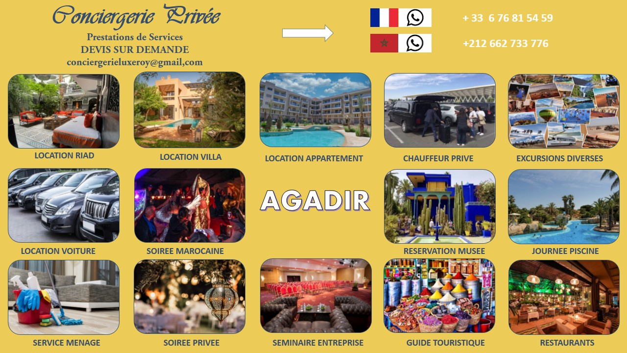 La conciergerie DAR B DAR est une structure spécialisée dans l’organisation de séjours sur mesure. Nous accompagnons nos clients de A à Z : hébergement, transfert, restauration, activités, bien-être et service 24h/24.